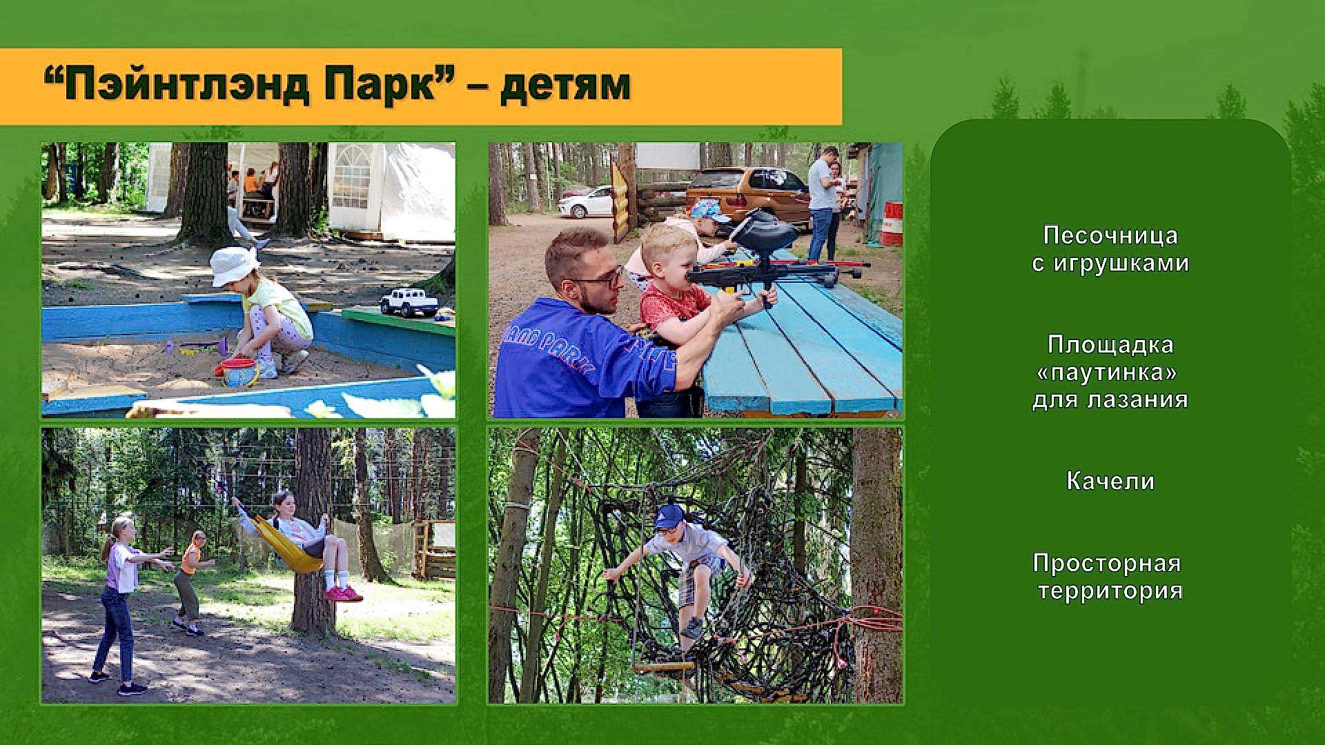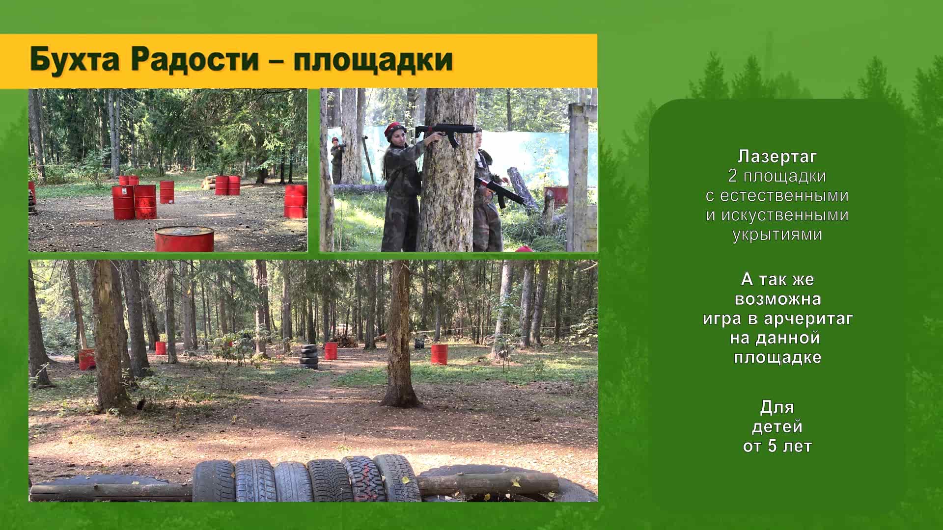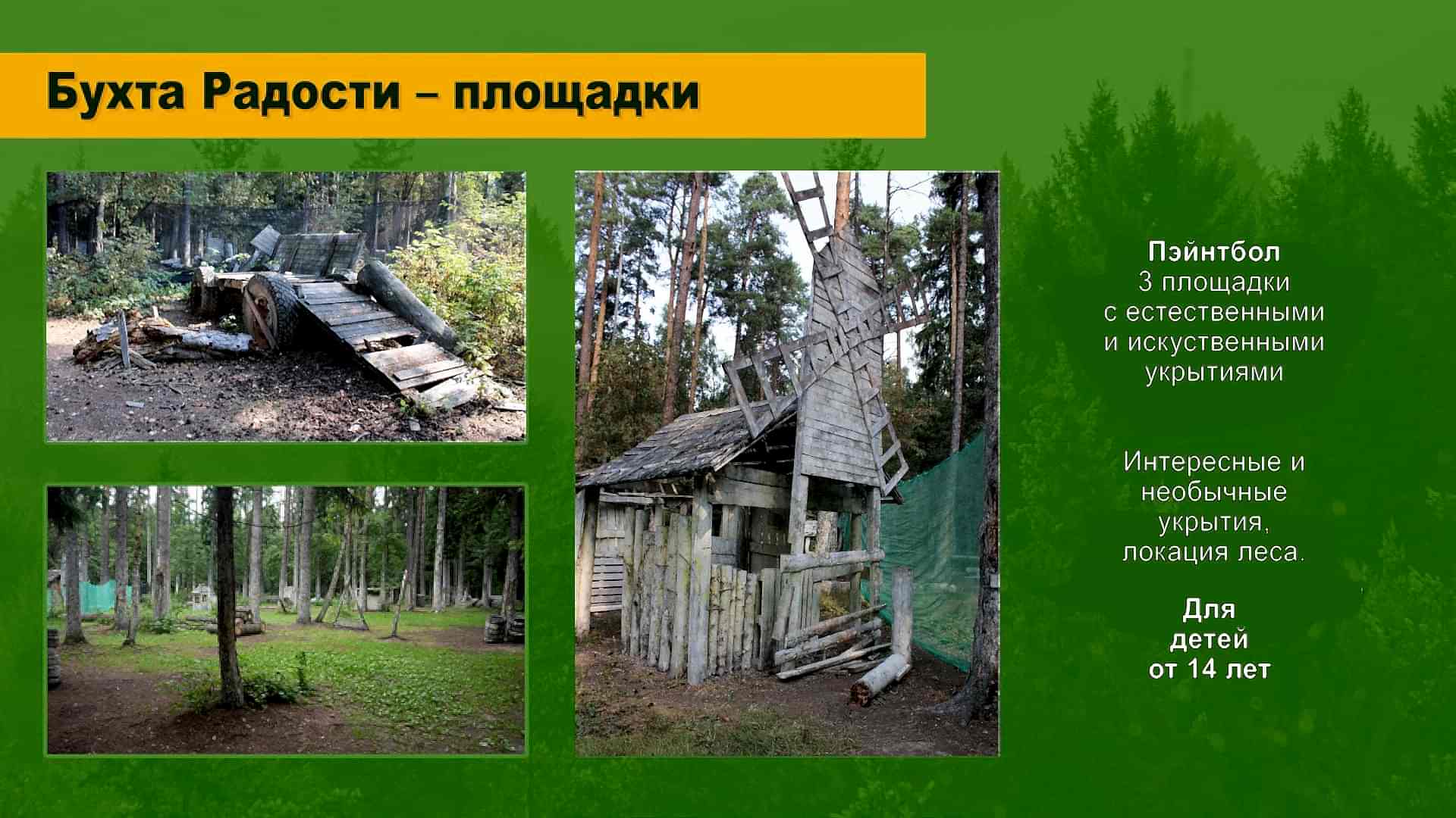 Пейнтбол, лазертаг, арчеритаг; квадроциклы; дни рождений, корпоративы и тимбилдинги; спортивно-развлекательные программы; отдых на природе в шатрах и юртах, пикники и барбекю. Собственная территория в живописном месте со специализированными и спортивными площадками.