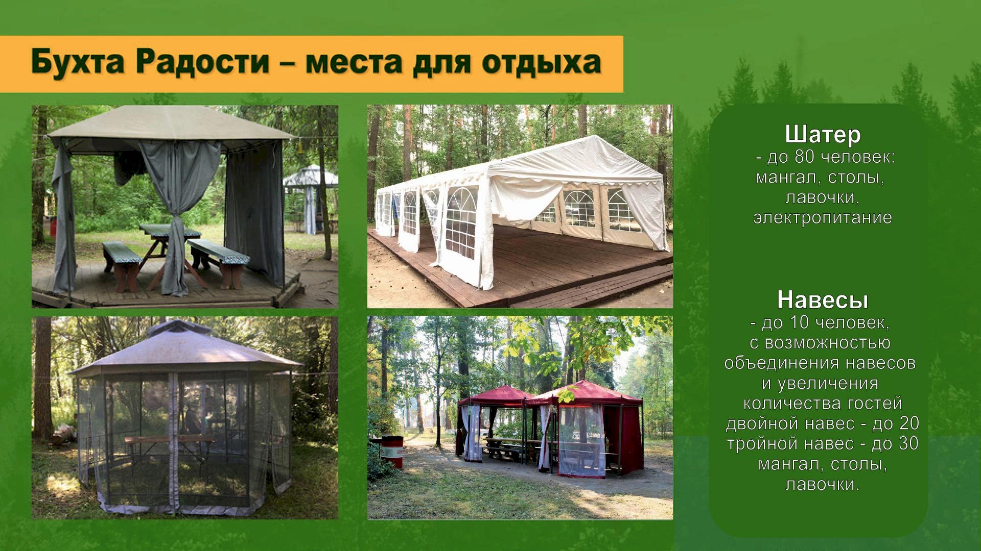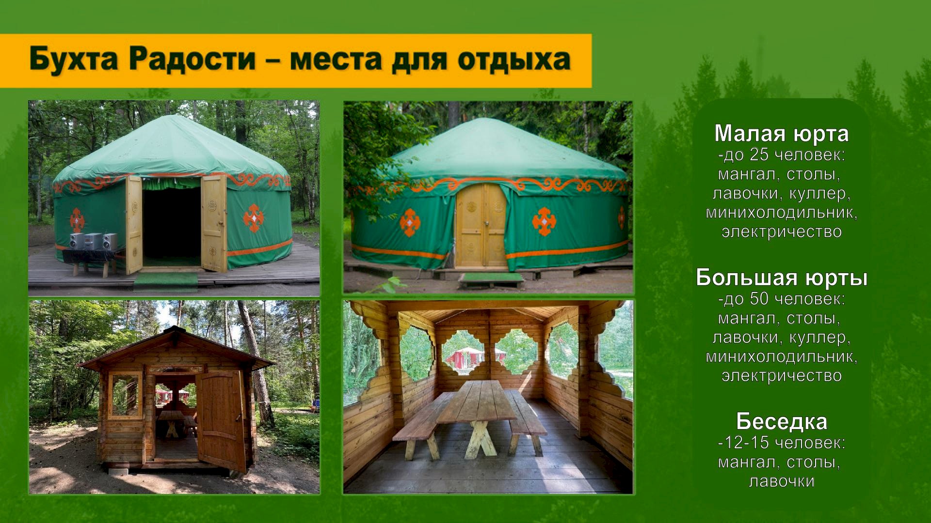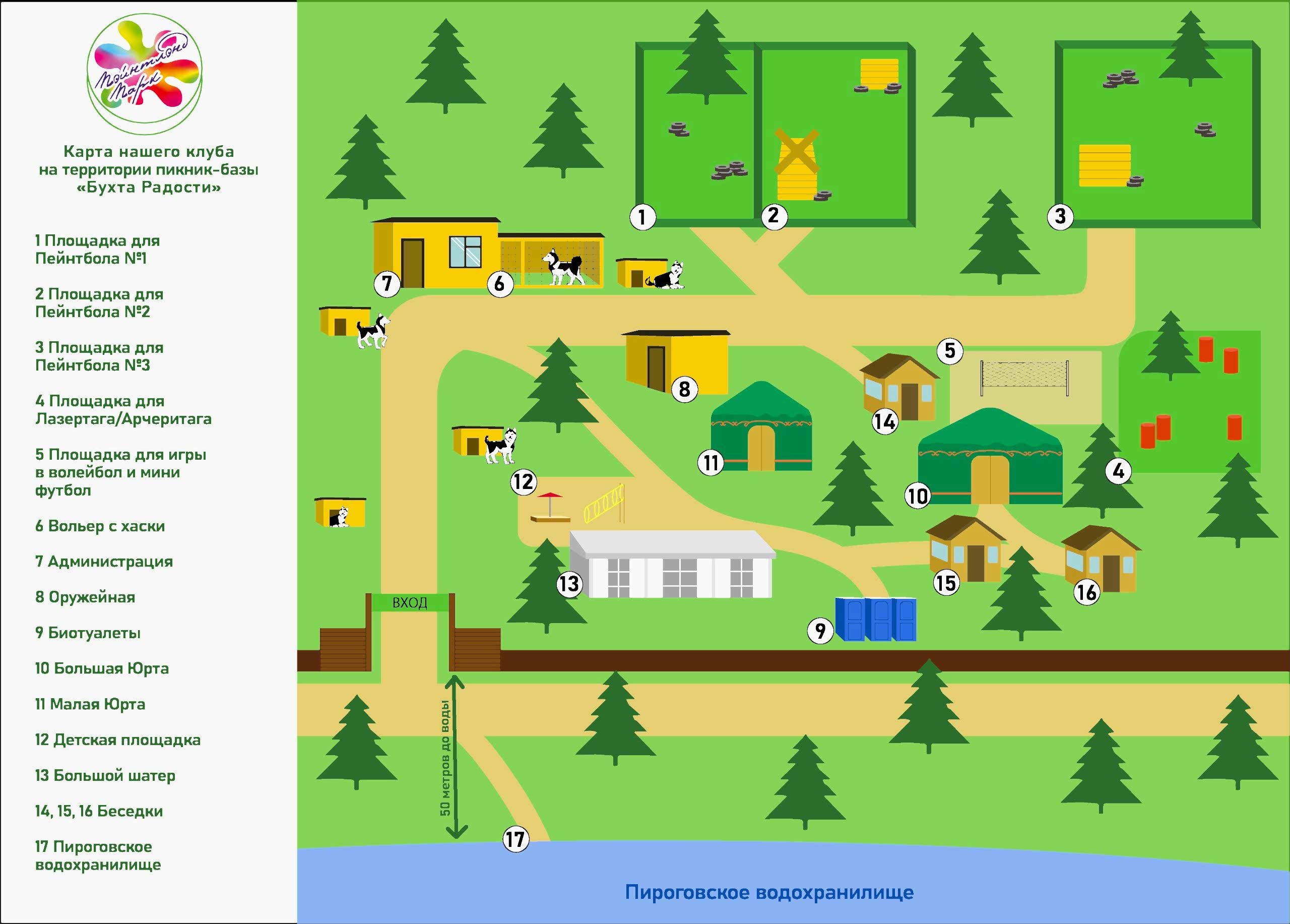 Пейнтбол, лазертаг, арчеритаг; квадроциклы; дни рождений, корпоративы и тимбилдинги; спортивно-развлекательные программы; отдых на природе в шатрах и юртах, пикники и барбекю. Собственная территория в живописном месте со специализированными и спортивными площадками.